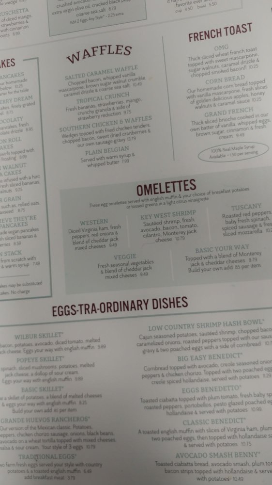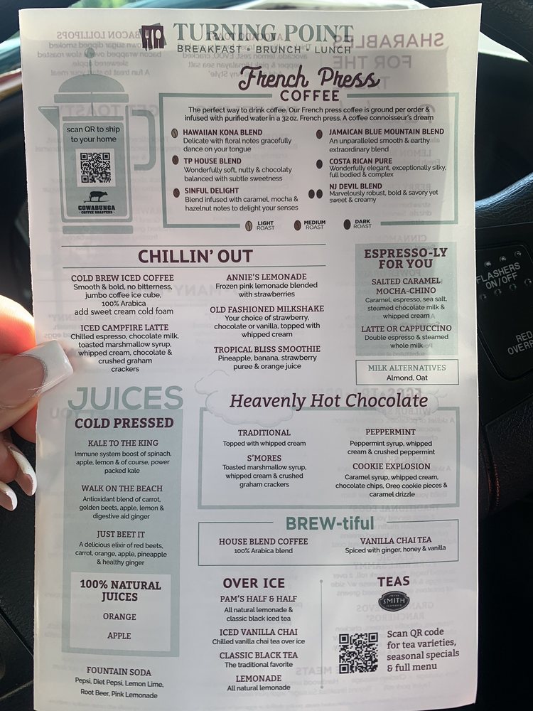 Introducing the menu at Turning Point of Manalapan, a breakfast and brunch spot in Manalapan, NJ, known for its welcoming atmosphere and delicious food. Customers rave about the friendly service and quality dishes, such as great eggs, fresh coffee, and a variety of dietary options including vegan, vegetarian, keto, and paleo. Seasonal items add excitement to the stable menu with no complaints about their coffees. The restaurant offers a casual dining experience with options for outdoor seating and happy hour specials.